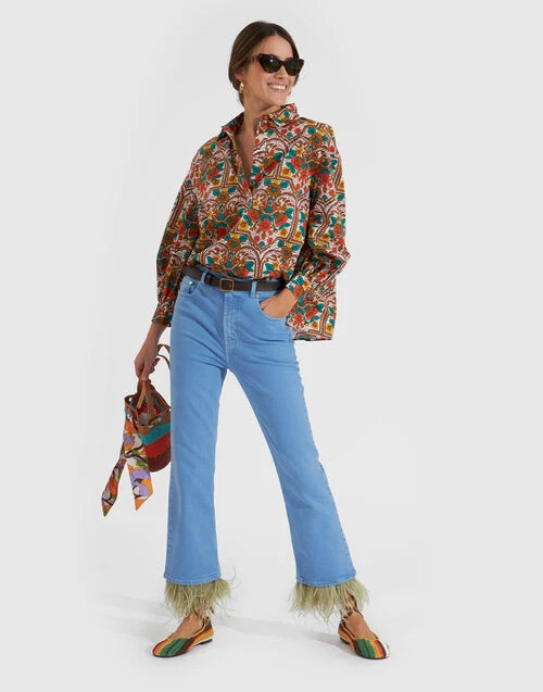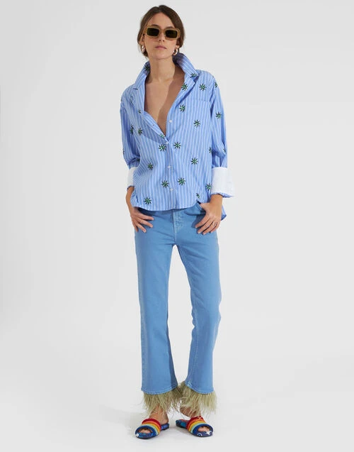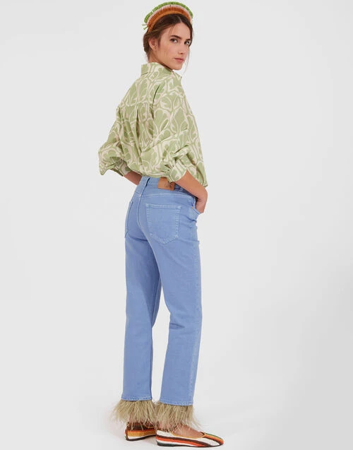 Who knew denim could be this fancy? With joy sewn directly into the seams, these jeans are the perfect summer to September transition trousers. Arriving in a shape similar to our iconic Hendrix Pant with a cropped, slim fit that widens a touch at the knee, these beauties arrive in our high-vibe sky blue wash with a removable feathered cuff that feels anything but fussy. We love these paired with our slogan tees, but they look just as elegant taken out on the town with a statement printed wedge and 24/7 Jacket.