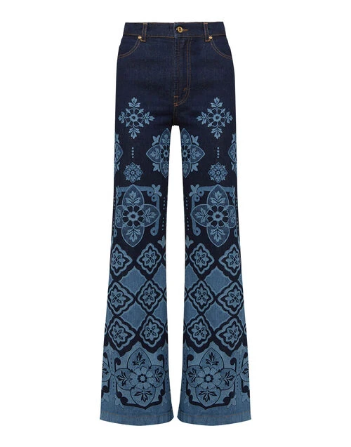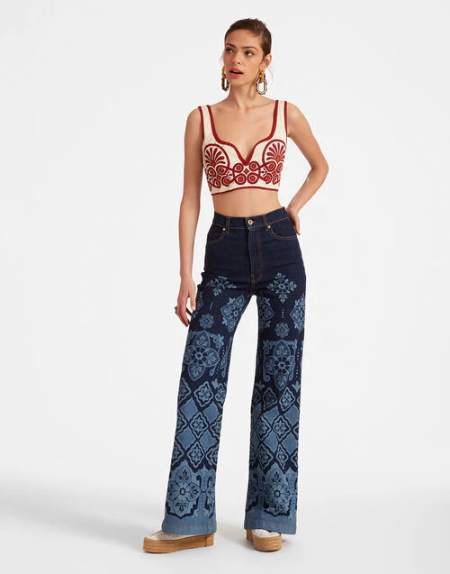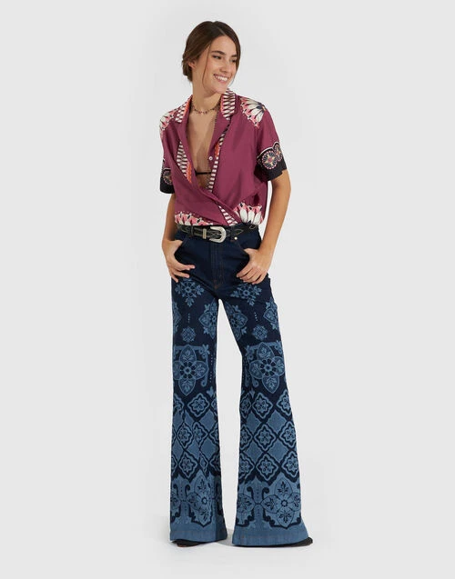 La DoubleJ does denim! Designed for those looking to elevate this everyday essential, these are not your average flares. With a super high waist that hugs your curves in all the right places, these are a modern take on a retro classic, arriving in our exquisite hand-placed, laser-printed Corte print which keep this dark denim from feeling anything but basic. Falling straight to the knee before opening up into a wide, romantic bell-bottom, these beauties have a little stretch built in, so you can channel your inner Studio64 without diminishing their booty-boosting shape. We’re partial to pairing it with our Sisterhood Bomber, but think these are print perfect with our Boy Shirt or any classic tee already in your closet.