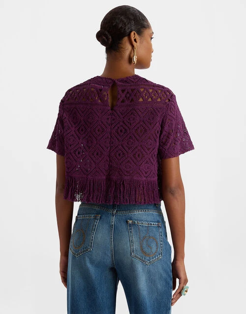 Our favorite high-low tee reimagined in macrame knit to exude dreamy vacation ease wherever you are in the world. With detailed finishing, it features a cool, cropped T-shirt silhouette that leans into a boxy, boyish vibe. Belissima and breezy with the matching macrame Drawstring Skirt or Glastonbury-ready worn with your favorite jeans.