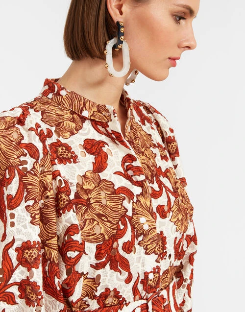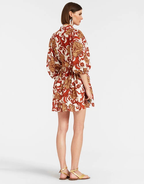We took our signature silhouette, the best-selling Portofino, and made her mini for those hot summer nights at Splendido Mare. Same voluminous sleeves, same chic, Korean collar, same laid-back allure, just with a little more leg to show off that tan. The nipped in waist now comes with a removable ribbon belt so you can emphasise your forma or float free as you wish. Cut in our crisp printed lace, you’ll be wearing this beauty from espresso to aperitivo all summer long.