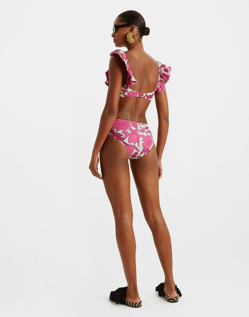 A straight-up summertime stunner, the Ruffle Bikini Top has an elegant square neckline and eye-catching ruffle trim that frames the decolletage. Cut from textured piquet lycra, it comes in our latest greatest prints with a clasp at the back to secure. Wear it with our matching Good Butt shorts and you are ready for your lobster lunch in the Amalfi, baby.