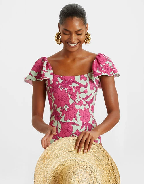 This suit is movie-star maximalism at its FINEST. Inspired by one of Hollywoodâs most iconic badass babes, Scarlett OâHara, this stunning one-piece brings romance to the Riviera with fluttering ruffled sleeves and a sleek square neckline. Doing double duty like the diva she is, this swimsuit is as breathtaking solo as it is worn under our voluminous Big Skirt for full Gone with the Wind gorgeousness.
