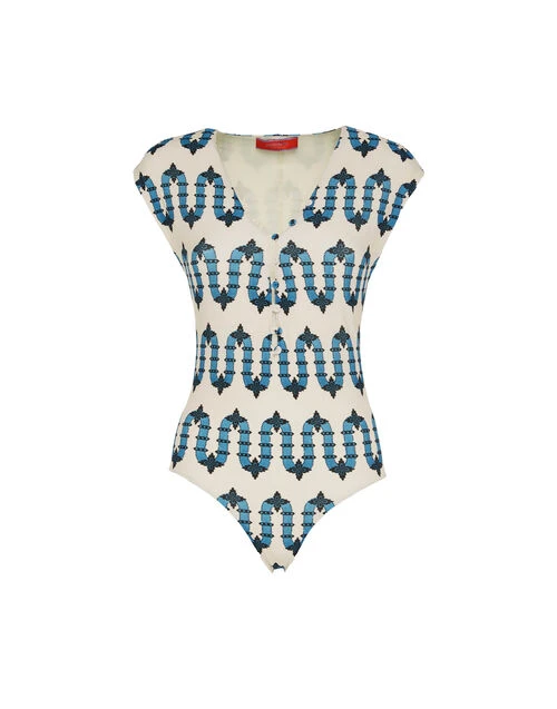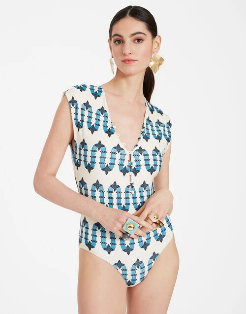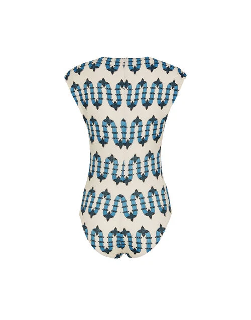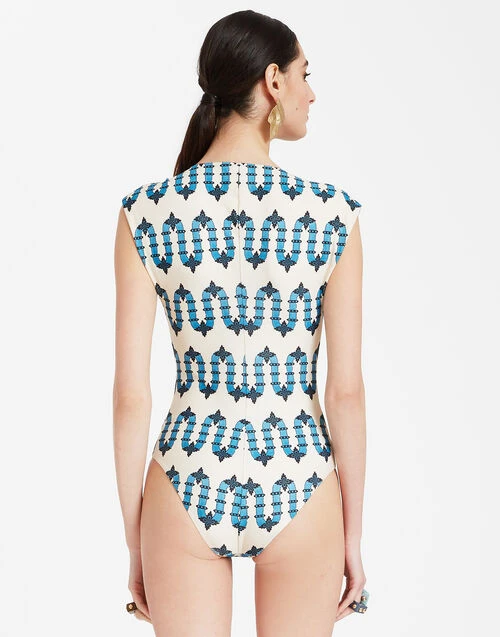 Part swimsuit, part bodysuit, the Tutto (as the name suggests) does it all. With a mini cap sleeve and and high -but-not-too-high cut hip, this is a bathing suit you can actually ride (and make) waves in. With buttons down the neckline you can make that V as deep or shallow as you wish. Gorgeous with pants and skirt, but of course she stuns solo also.